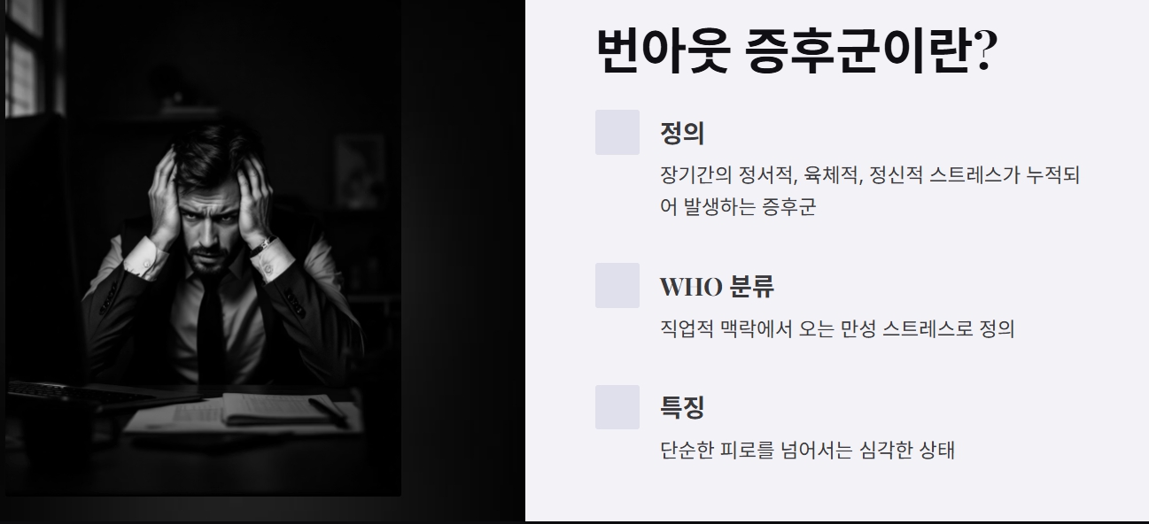 번아웃(Burnout)은 단순한 피로를 넘어서, 장기간의 정서적, 육체적, 정신적 스트레스가 누적되어 발생하는 증후군입니다. WHO는 이를 '직업적 맥락에서 오는 만성 스트레스'로 정의합니다.